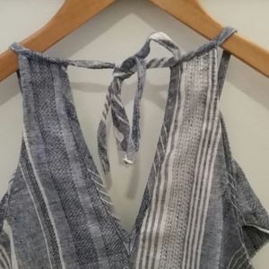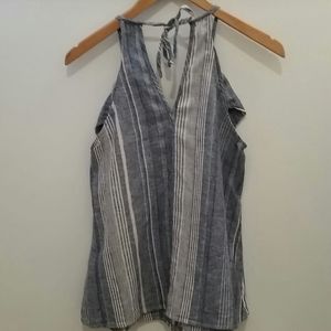 Striped chambray tank with a ruffle detail down the front center. Key hole V cut opening at the back with a string tie closure.