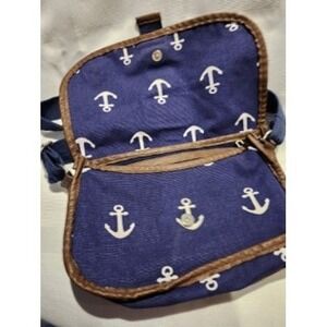 Keywords: Sloane Ranger, crossbody bag, nautical, anchor print, navy blue, purse, shoulder bag, casual bag, beach bag, preppy, coastal, women's bag, flap bag, brown trim