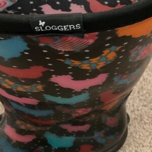 Colorful rain boots with a chicken pattern. Perfect for rainy days. Worn only a few times. Made in the USA