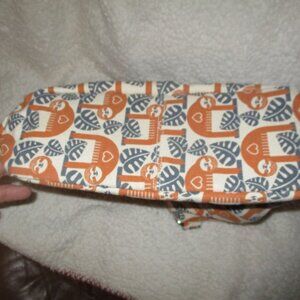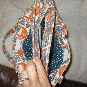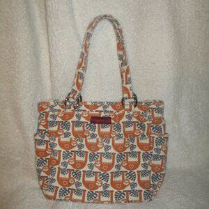 Bungalow 360 sloth print bag. 2 handle - 3 compartments - the main center has zipper closure - the other 2 have velc closure - 2 slip in pockets on front and one on each side. Three inside pockets one that zips. Polkadotted lining.