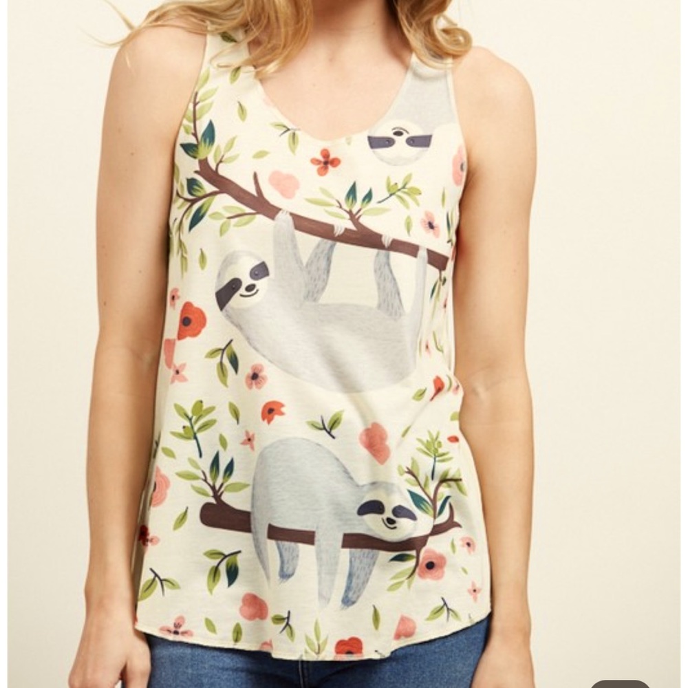 Sloth print on off white tank, unfinished stitched edges. 100% polyester.