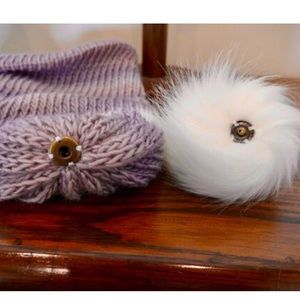 Reversible hat, 1 side has removable snap pom, other side is worn as beanie with no pom