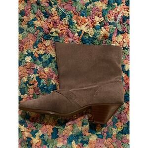 Vintage, Woodbridge (who knew they make wine and shoes ;), sandy-beige, suede booties. Wide shaft that can fold over is slouchy. Perfectly sized kitten-cone heel is comfortable all day wear. Lovely almond shaped toe is just the right amount of pointy. Size 8.