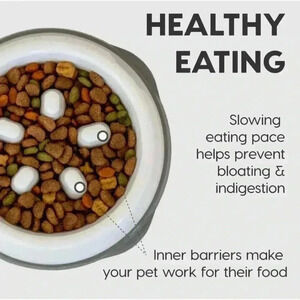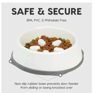 This is a new, white slow feeder bowl for dogs. It is made of durable plastic and has a grey rubber base to prevent slipping. The bowl has a diameter of 8.88 inches and a height of 2.25 inches. It features inner barriers that make dogs work for their food, slowing down their eating pace and helping to prevent bloating and indigestion. The bowl is BPA, PVC, and phthalate free. It is new without tags or box.