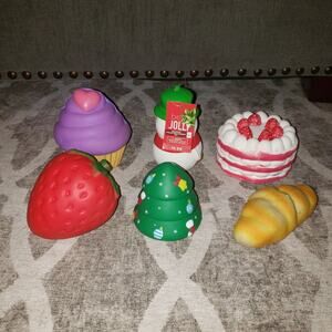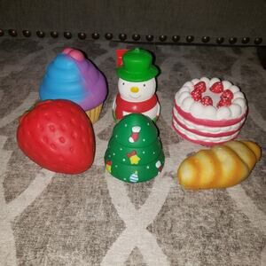 Follure strawberry squishy cake, soft'n slo strawberry heart cupcake, snowman, Christmas tree, strawberry, and baguette. In great condition from a smoke free home.