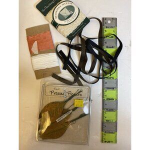 Very Good to Excellent Condition. White linen scraps have some red bleed on them. Owl sticker has a curled corner. Some new without tags embellishments. Photographs show all.