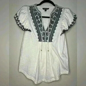Effortless romance defines Lauren Ralph Lauren's top, which is crafted from slub jersey for a soft, slightly textured hand. Distinguished by eye-catching embroidery at the bib and sleeve cuffs, a self-tie accent at the neck and breezy flutter sleeves offer a whimsical finish.