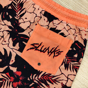 The product is a pair of limited edition Slunks Creames shorts for men in size medium. These shorts are lined, perfect for volleyball, swim, or sports activities. The colorful design features a multicolor tropical pattern and is manufactured in China. Ideal for those looking for a unique and stylish addition to their athletic wardrobe, these shorts offer both performance and fashion.