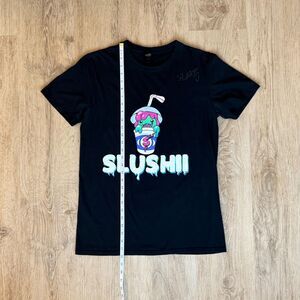Fun and vibrant Slushii tee featuring a colorful cartoon slushie monster design with dripping font across the chest. Autographed by Slushii in silver marker near the collar, adding a collectible touch for EDM fans.