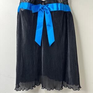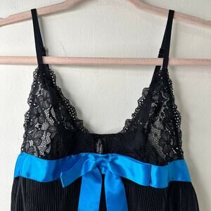 This black sheer micro-pleated chiffon piece features a lace bodice, adjustable spaghetti straps, & a wide satin blue ribbon waistband finished with a large bow on the front. The lettuce hemline & delicate construction give it that unmistakable early 2000s angel energy. Measuring 26” long, it can be worn as a mini slip dress for a daring Y2K look or as a babydoll cami top layered over jeans or a skirt.