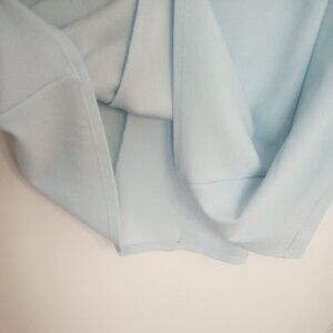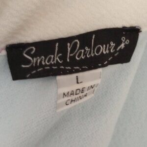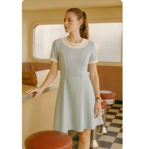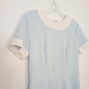 Smak Parlour baby blue Retro 60's Dolly Girl style. Short sleeves, round neckline with contrasting white trim. Bodice is fitted with princess seaming, and flared skirt. Fabric is stretchy. Cute vintage mod retro style.