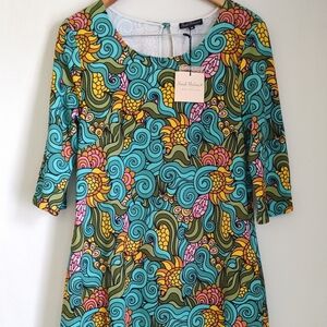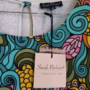 Elevate your wardrobe with this groovy sunflower Smak Parlour Fit and Flare. Featuring a stunning multicolor pattern, Three quarter length sleeves with key hole button details. This piece is perfect for adding a pop of color and pizzaz to your wardrobe. Ideal for casual or dressy occasions. NWT with a few thread pulls pictured.