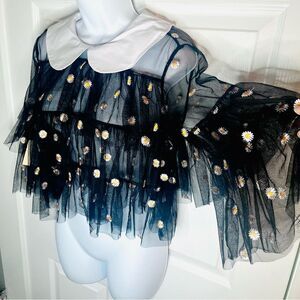 Smak Parlour Black Embroidered Daisy Mesh Ruffle Top Tiered Peter Pan Collar Size Medium NWT. NO CAMI INCLUDED - see thru top. Sweet crop top in fabulous black sheer mesh dances with embroidered daisies. Relaxed tiered ruffled silhouette contrasting white Peter Pan collar and three-quarter length sleeves. Imperfect Raw edge hem. 100% Polyester Hand Wash Cold, Material Is Sheer. Model in Size M. New with tags.