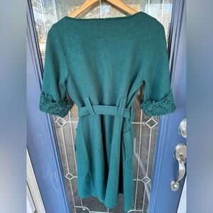 Anthropologie sleeping on snow 100% wool forest green crochet 1/2 sleeve coat. Excellent condition. Some very light pilling around pits, pictured. Has pockets. Unlined. Size small.