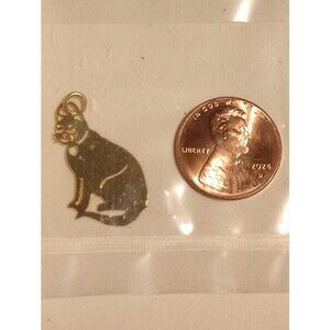 Thin 24 k gold cat finishing charm. New in bag. Made by Lil Charms in New Hampshire. Card is dated 1987. Charm is small (see picture with penny).