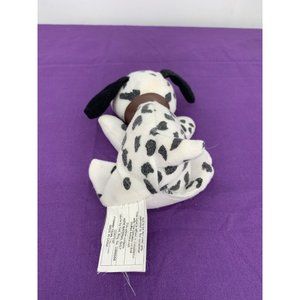 A charming 6-inch white dog toy detailed with black spots. It features a brown pleather collar and plastic eyes and nose, perfect for collectors or play.