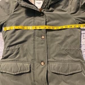 Small Abercrombie & Fitch coat. This utility coat has wind & water resistant fabric. It is lined on the inside with a Sherpa like material and is in great preowned condition. It’s a military green and comes from a smoke free home. It both zips and buttons with an inside drawstring waist plus 2 outside pockets.