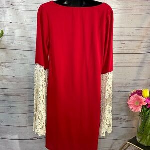 Elegant red dress with intricate lace sleeves, perfect for any occasion.