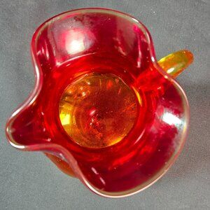 Vibrant hand-blown amberina art glass pitcher featuring a ribbed body and clear handle transition. Beautiful color gradient from deep ruby red to golden orange. Measures approximately 5" tall and 6" wide including handle.