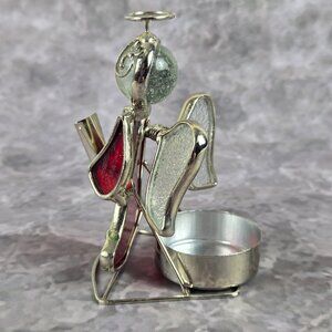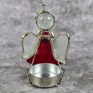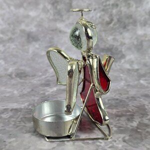 Small tealight candle holder is formed as an angel holding an open book. Her robe is red glass with her wings being a clear textured glass. The head is a clear round orb. All trim is in silver. Free standing.