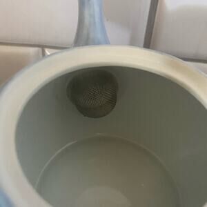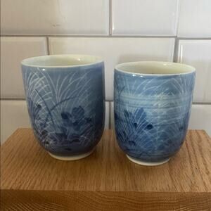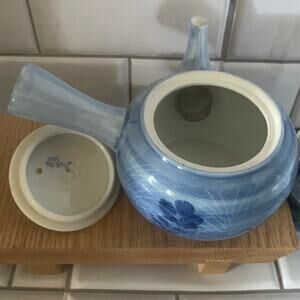 Small side handle blue print teapot with two teacups could use for expresso also. Teapot has a screen over the spout. No cracks or chips marked with asian characters. Teapot 4” T x 6 1/2” W x 4” diameter, cups 3 1/2” T x 2 3/4” diameter