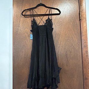 tags on, never worn, in great condition \\Don the Free People Adella Slip Black Lace Dress for a romantic Boho look! Crochet lace, with pretty pierced detailing, shapes a bralette inspired bodice atop a set-in waist and gauzy, woven swing skirt with tiers of ruffled trim at the handkerchief hem. Two sets of adjustable skinny straps crisscrossing at back for an eye-catching effect. Smocked back panel ensures a cute and comfy fit. Pull-on design.