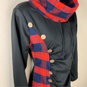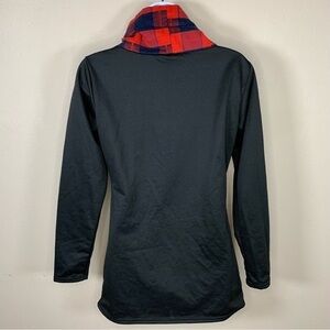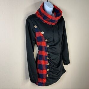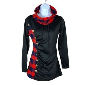 Small Black Red Plaid Cowl Neckline Top Long Sleeve Stretch