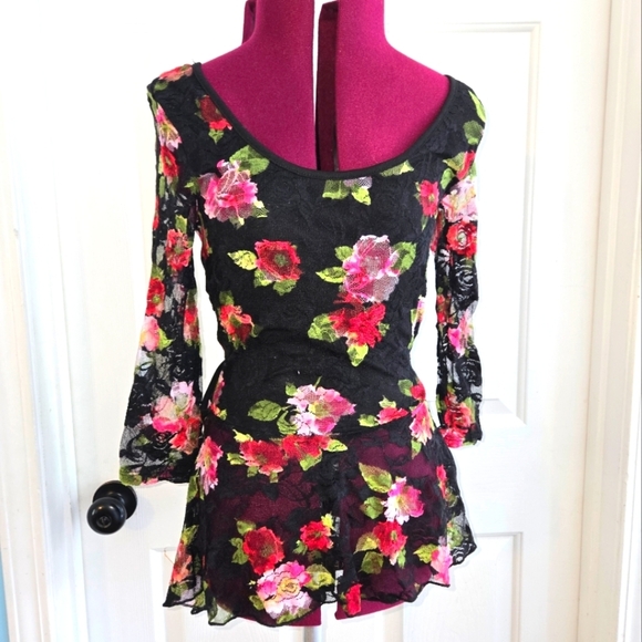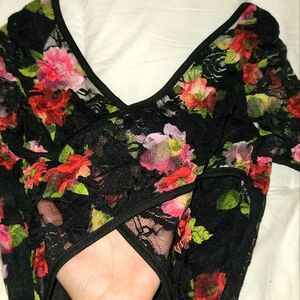 Good condition. Floral stretchy lace. TTS. Criss-cross back. Lace 3/4 sleeves