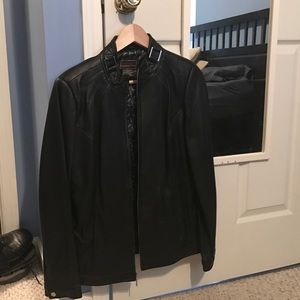 This black leather jacket is very nice on! Only worn a couple times!!! It's in perfect shape!