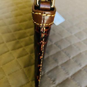 This is a small, thin brown Dooney & Bourke Mini Clutch with one short side detachable strap that will allow this beautiful bag to be converted into a wristlet. This bag is new with tags, has clean red interior with a pocket inside, and in excellent condition.