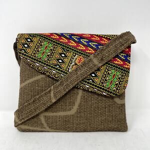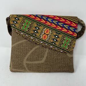 Small burlap and colorful African style print shoulder bag purse. Zipper closure main compartment, flap with snap closure, adjustable strap. Good used condition with marks & wear as shown, please see pictures. Measures about 8" x 8" x 1".