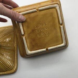 This is a two-piece baking dish set from Calif USA, featuring a square yellow ceramic dish with a weaved basket design and a lid. The set includes a small casserole dish with a length and width of 6 inches. Made in the United States in the 1960s, this pottery piece adds a touch of vintage charm to your kitchen.