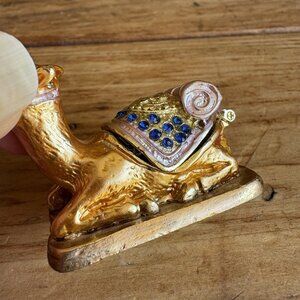 Small Camel Enameled Trinket Box Magnetic Closure 2” long 1” Tall, blue rhinestones