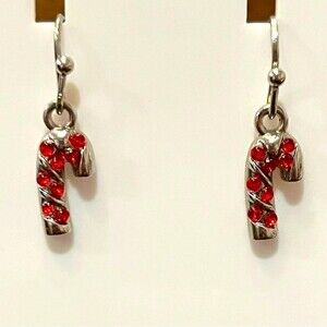 Small Candy Cane Dangle Fashion Earrings Silver Tone with Red Gems NEW