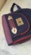 Colors: navy, maroon, and purple, with silver toned hardware. The fabric lining is a soft red flannel. Overall, minimal wear noted.
