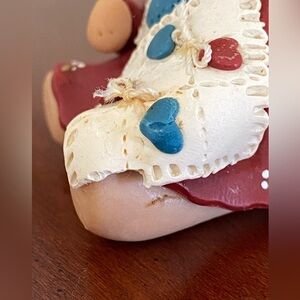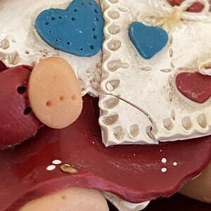 Adorable clay woman making a quilt. Made of clay. Some cracks. See photos. Very cute for the crafter in your life.