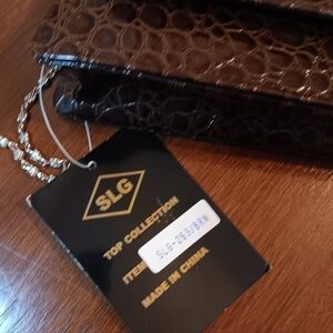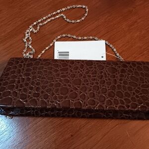 This is a small brown, clutch purse with a silver chain that would be nice for an evening out or a more formal occasion where you don't need to care much and don't want to deal with a bigger purse. It is in excellent condition and has no wear. It is patent leather.