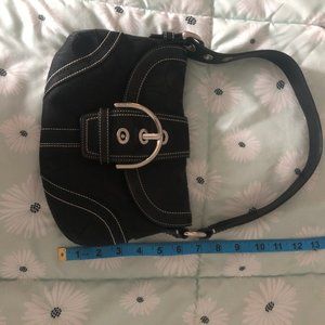 Small Coach Purse Authentic Excellent Condition. Black with gray stitching. No rips or stains, non-smoking house. Used once or twice. Please see the images for size, approx. 10 inches across, 7 inches high, 4 inches wide. This is a small purse, holds wallet, keys, minor essentials.