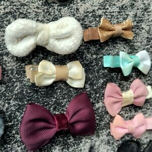 Charming set of hair bows. Includes various colors and textures. Perfect for accessorizing.