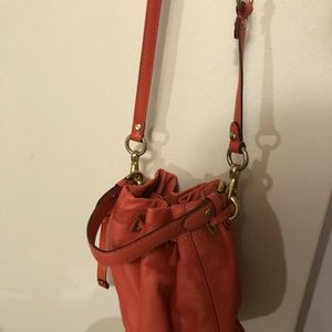 Small Coach 2010s bag, peachy/coral color. Drawstring closure with a short handle and long crossbody strap. Cute for summer!