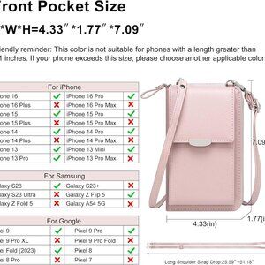 Upgraded Version Phone Pocket: All-in-one crossbody phone bag extended it's phone holder dimension, fit for the smart mobile phones with a big screen of 6.5 inch and below, such as iphone XS Max,XR,X,8 plus,7 plus,Samsung Galaxy Note 9,Note8,S9, S8,ect.