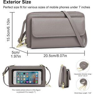 Features: This sleek leather wallet is designed with a clear touchscreen window so you can easily operate your phone without taking it out — ideal for quick access while shopping or on-the-go. It features a secure snap closure, dual zipper compartments, and multiple slots for cards, cash, and essentials. Comes with a comfy, adjustable crossbody strap and a removable wristlet, making it super versatile for travel, errands, or a night out.