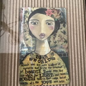 This piece of art measures 6” x 8”. It has a picture of a woman with a saying under it. From 2010s.