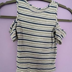 Blue striped top from Design Lab, stretchy material. Cold shoulder short sleeves. Great to tuck into jeans and shorts. Slightly cropped.