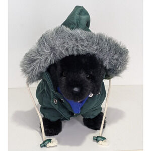 This small dog parka in dark green is perfect for a Chihuahua or Pomeranian. It features a hood with fur trim, a hook and loop snap close for easy on and off, and is designed specifically for winter apparel. The cute design and quality features make it a must-have for keeping your furry friend warm and snug during colder weather.