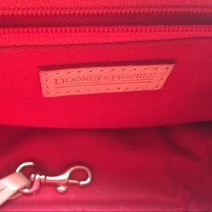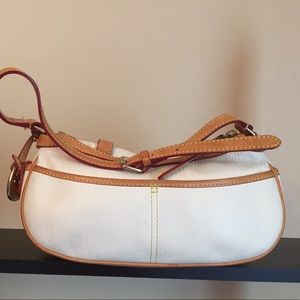 Small Dooney & Bourke Purse. Very classy white leather with light brown leather trim. Perfect designer starter purse for tween, or simple & elegant handbag for a night on the town. 4 exterior storage pockets: 2 storage pockets with secure belt closure on frontside of purse; and 2 open storage pockets on backside of purse. 2 interior storage pockets: 1 zip-close, medium size storage pocket, and 1 small, open storage pocket. Attached key clip. Adjustable buckle on shoulder strap. Top-zip close.