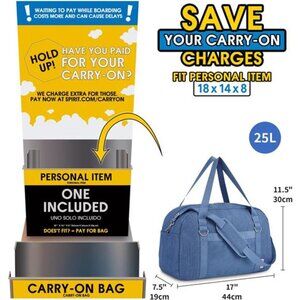 Bag size 17x11.5x7.5 inch (Capacity 25L) fits personal item size 18x14x8 of Spirit Airlines & Frontier Airlines, which can be placed under seat and no need to pay carry-on. 25L main compartment could accommodate all your travel items for 3 to 4 days or a week's worth of lightweight clothes