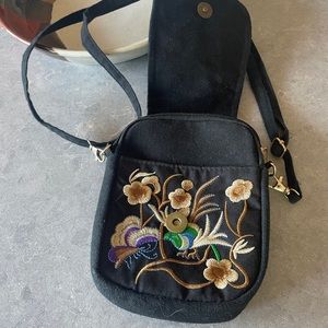 Never used 3 compartment (2 zippered) with belt loop and adjustable strap. Beautifully sewn floral design on front flap and inside with magnetic snap closure. Strap adjusts to 20” or 30” hanging length. Bag is approximately 6” x 8” x 1.5”