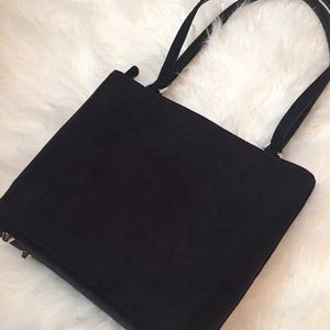 Small, suede-like bag with bright floral embroidery. Super cute! NEW without tags. Zippered pocket. Metal feet on the bottom. 10”x8”. Strap is 21” long.