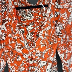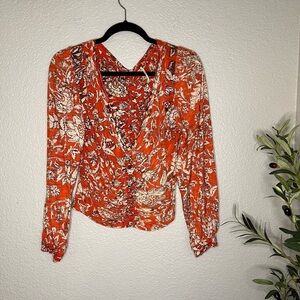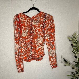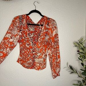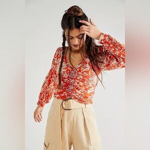 Small Free People Say The Word Orange Floral Red Combo Long Sleeve Ruched Top